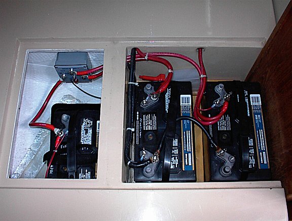 This photo shows two Group 27 deep cycle batteries in the standard battery location. To the left of these a small shelf was glassed in to provide a mounting point for an additional Group 27 deep cycle battery. Also in the compartment to the left, notice the three bank battery combiner to provide simultaneous charging via the alternator, wind generator (removed for now) or charger.