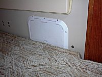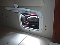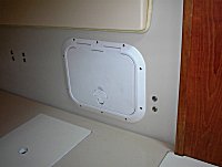 Below are pictures of an inspection hatch I installed in the bulk head between the quarter berth and the engine compartment. It gives great access to the starboard side of the engine. Working on the mechanical fuel pump, throttle linkage, checking/changing oil , etc. are no longer the chore they once were. There is no noticeable increase in noise level when the engine is running. The inspection hatch seen here is a Bomar G8812-W and has a single rubber gasket to make a tight seal. Bomar also makes a G8812-22 that is off-white and would probably be a better match. They also make an access hatch (G7812-W or G7812-22) that is double gasketed.